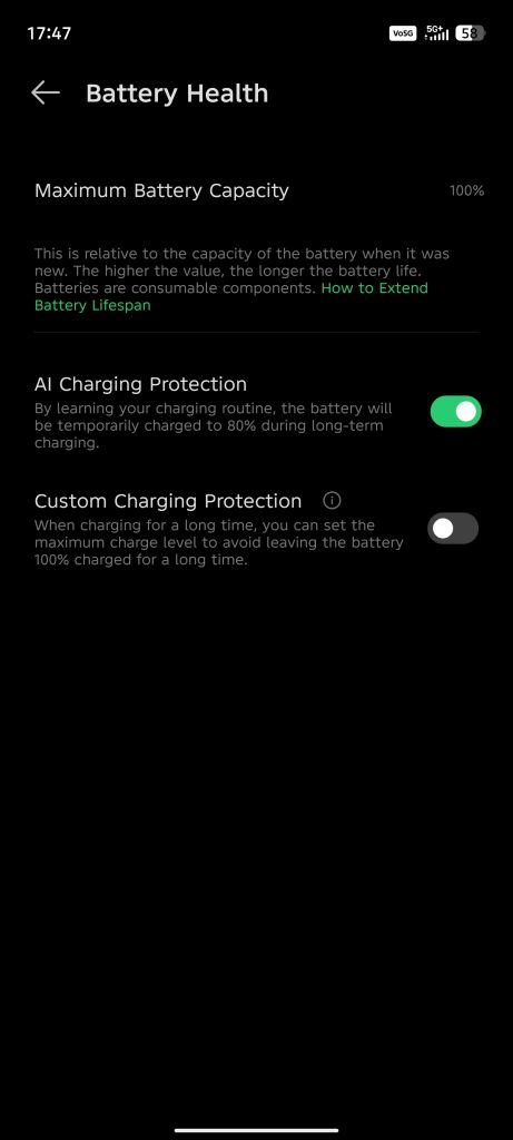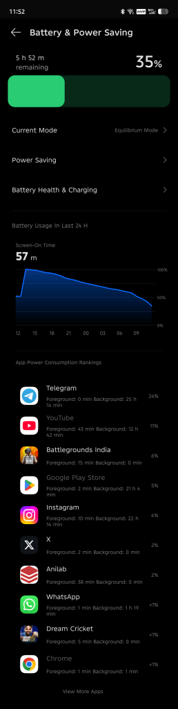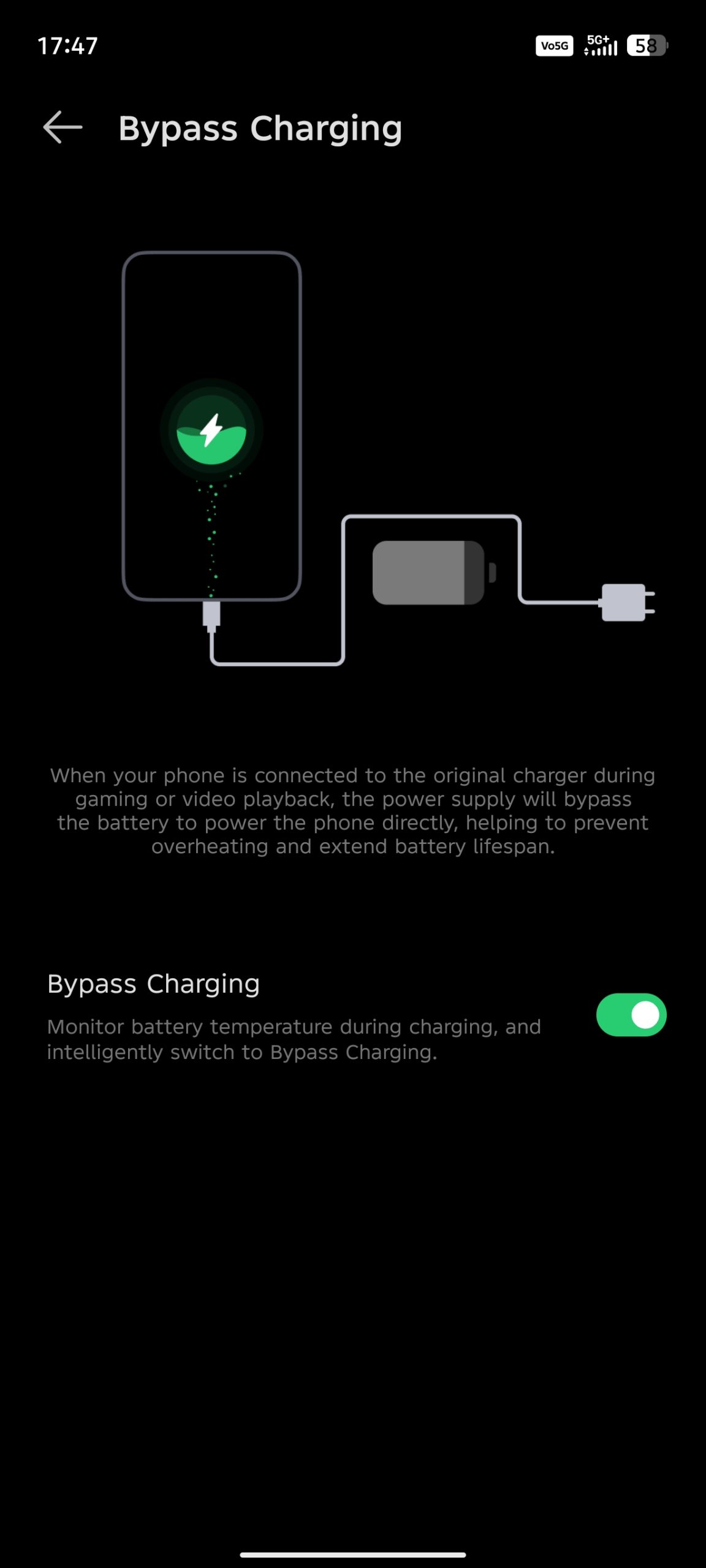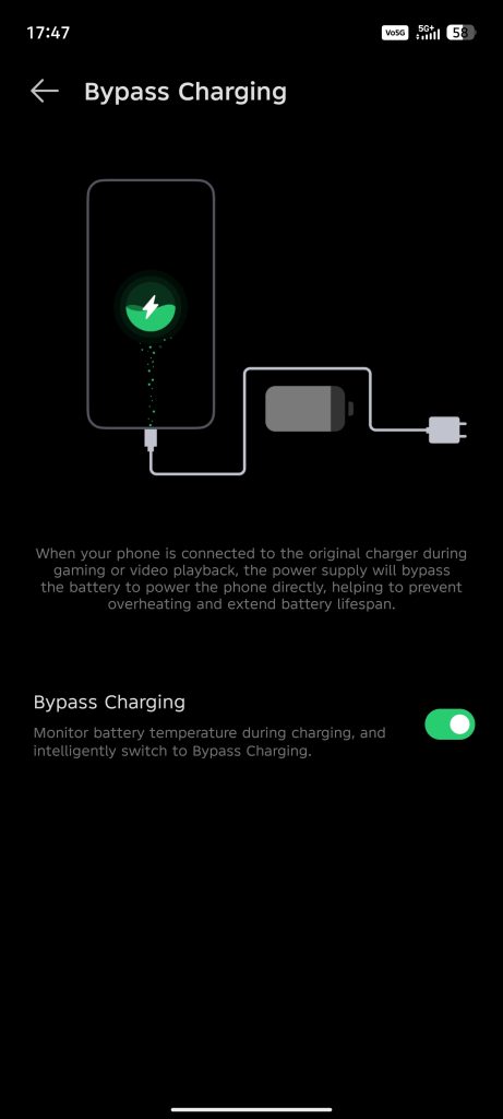 Charging is consistent and fast. A full charge takes a little over an hour with the bundled 45W charger. A useful addition is passthrough charging, which allows the phone to draw power directly from the charger while bypassing the battery, reducing heat generation and preserving battery health during gaming. This feature is particularly useful for gamers and is easily accessible within the game assistant overlay.
