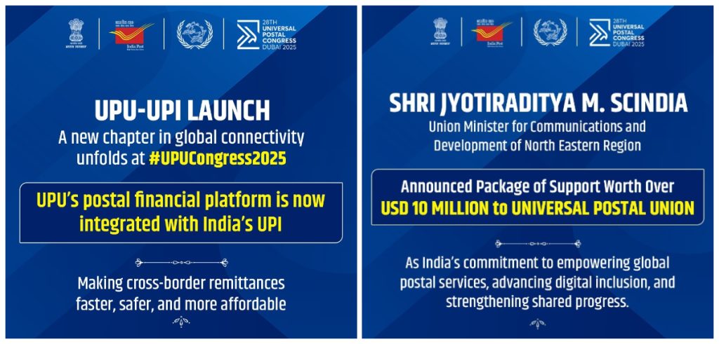 Union Minister for Communications and Development of North Eastern Region, Shri Jyotiraditya M. Scindia, unveiled the UPI–UPU Integration initiative at the 28th Universal Postal Congress in Dubai. The project is designed to reshape international remittances by merging India’s digital payment system with the global postal network.