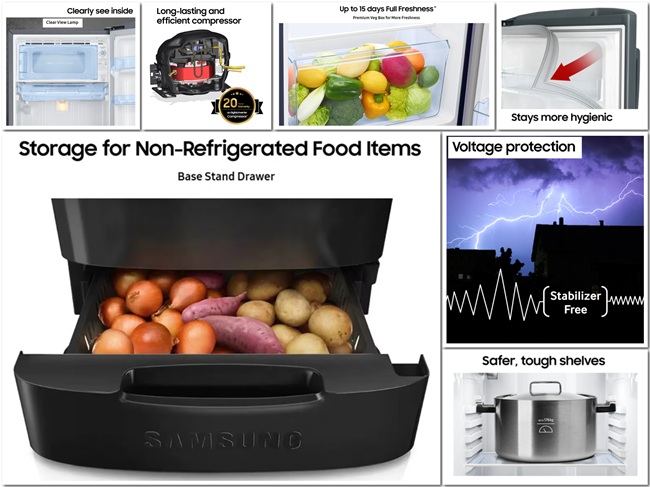 - Base Stand Drawer (on select models): Adds 11.8L of extra storage for items such as onions and potatoes, keeping them outside the cooling compartment.