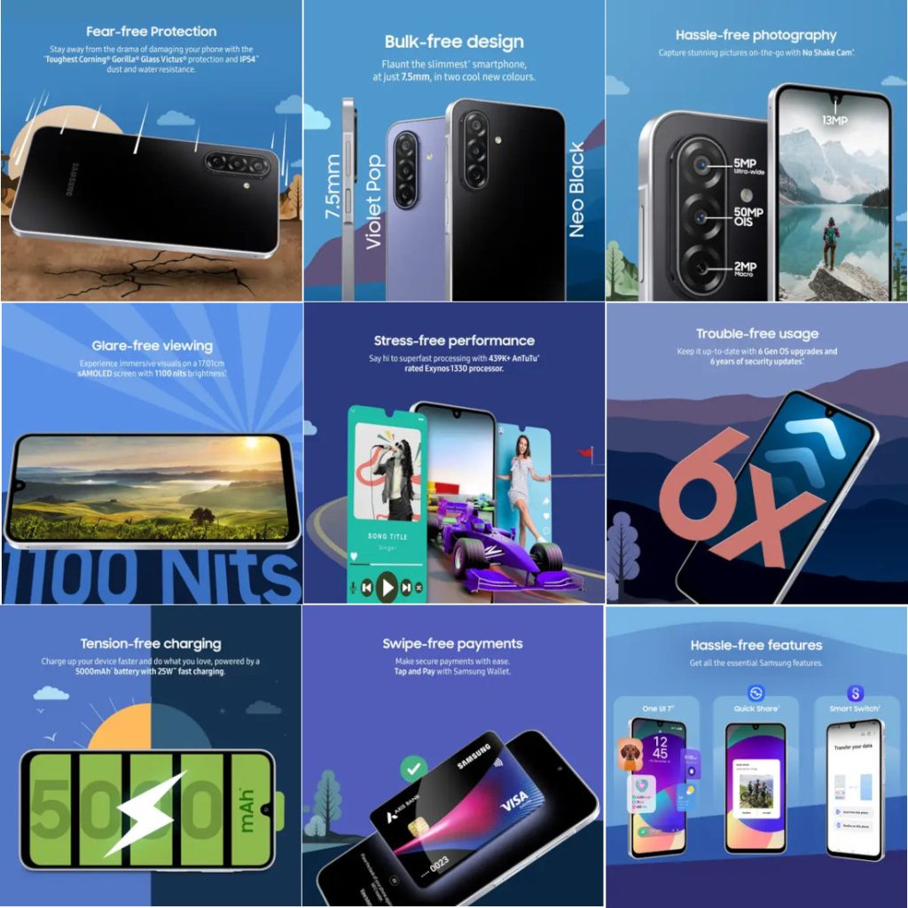 It retains the 50MP main + 5MP ultra-wide + 2MP macro camera and a 13MP front camera. The phone runs Android 15 with One UI 7 on top, and will get 6 OS updates and 6 years of security updates. The screen has Corning Gorilla Glass Victus protection.