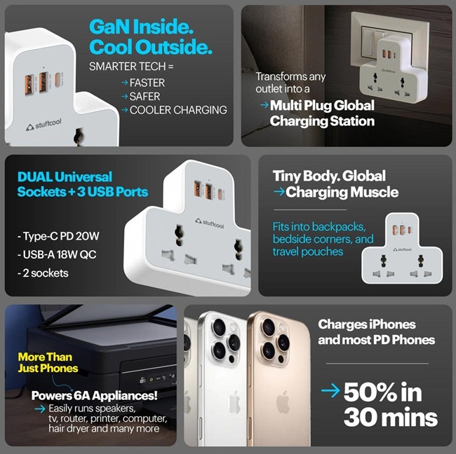 Stuffcool has introduced the Charge T, a compact dual-socket universal multi plug featuring a built-in 20W GaN fast charger. The device is designed for Indian switchboards, fitting without obstructing adjacent switches.
