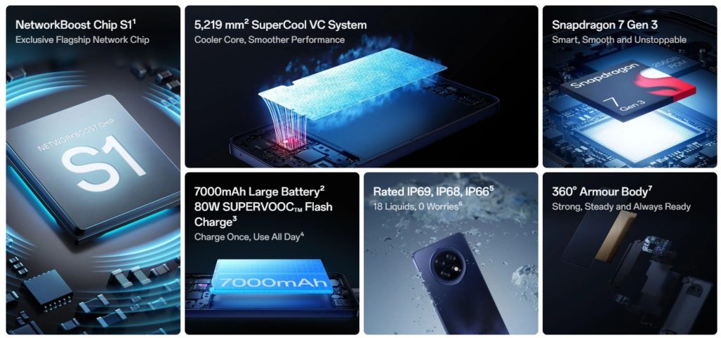 The F31 Pro+ is powered by Qualcomm’s Snapdragon 7 Gen 3 processor, built on a 4nm process. Its Octa-Core Kryo CPU includes a 2.63GHz Cortex-A715 Prime core, with an Adreno 720 GPU and Qualcomm AI Engine providing a claimed 60% improvement in performance per watt.