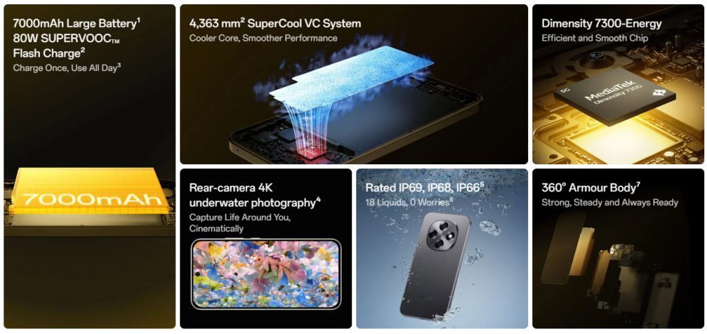 The F31 Pro uses MediaTek’s Dimensity 7300-Energy, another 4nm octa-core processor, with a Mali-G615 MC2 GPU. It also offers up to 24 GB of RAM (12 GB physical + 12 GB virtual) and UFS 3.1 storage. This model features a 4,363 mm² vapor chamber and expanded graphite sheets to help dissipate heat.