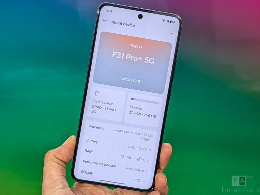 Powered by Snapdragon 7 Gen 3 SoC, the phone has up to 12GB of LPDDR4x RAM with up to 12GB of virtual RAM and up to 256GB of UFS 3.1 storage. It runs Android 15 with ColorOS 15 and will receive two OS updates and three years of security updates.