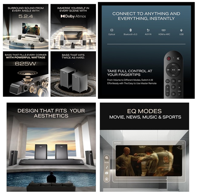 Multiple 2.25-inch and 2-inch drivers across the system provide clarity across frequencies, from bass to treble. Connectivity options include Bluetooth v5.3, HDMI (eARC), USB, AUX, Optical, and Coaxial, along with the same set of four EQ modes.