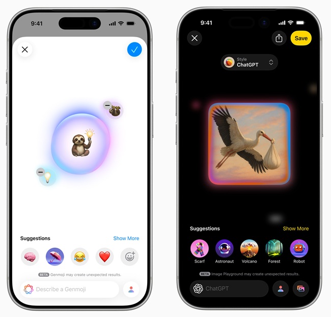 Genmoji and Image Playground let users create personalized emojis or artistic images. Attributes like expressions or hairstyle can be modified, while ChatGPT integration enables generation in styles like watercolor, oil painting, or custom designs.
