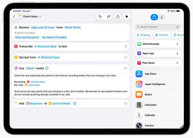 Intelligent Shortcuts allow users to automate complex workflows, such as document summarization, PDF extraction, or transcription comparison, running fully on-device or via Private Cloud Compute to protect privacy.