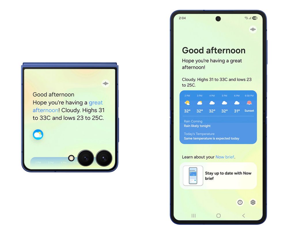 - Now Brief offers personalized daily updates on traffic, reminders, and Samsung Moments, allowing users to reflect on their routines. It also provides recommendations for music and videos based on subscriptions and interests, and integrates health data from Samsung Health and Galaxy Watch.