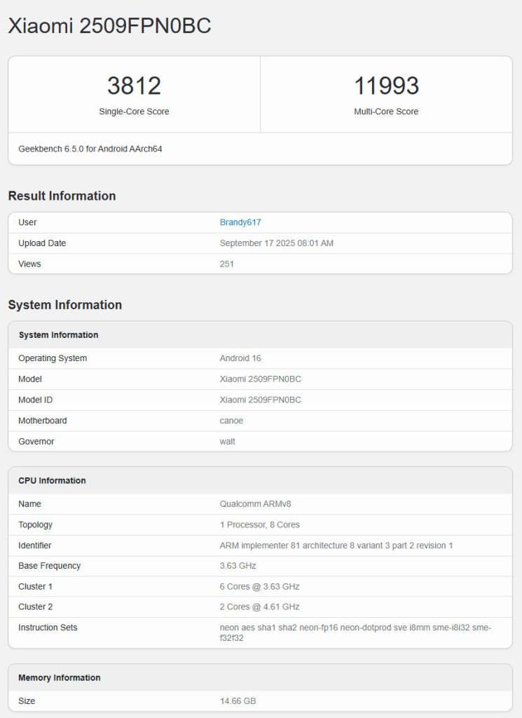Update: Xiaomi 17 Pro Max with the model number 2509FPN0BC has surfaced in new Geekbench listing, revealing the highest score of 3812 points on single-core and 11993 on multi-core. Even though Apple’s A19 Pro has crossed 4000 mark on single-core, it doesn’t beat the multi-core score of Snapdragon 8 Elite Gen 5.
