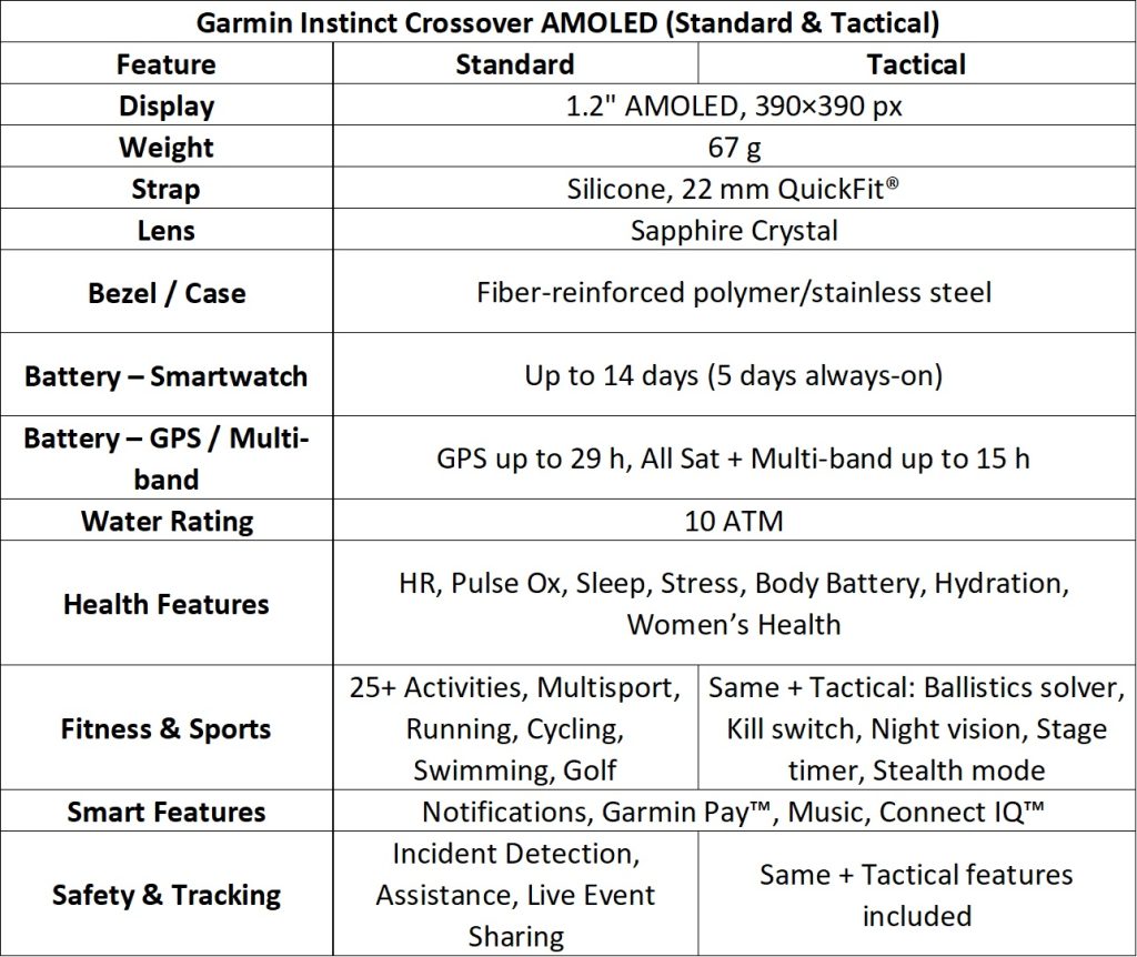 Quick specifications: Garmin Instinct Crossover AMOLED