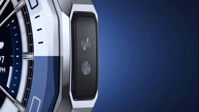 This premium luxury watch features an octagonal skeletonized case and a ceramic bezel, constructed for lightweight durability and robust aesthetics. It has a large 1.5-inch LTPO sapphire glass display with a peak brightness of 3500-nits.