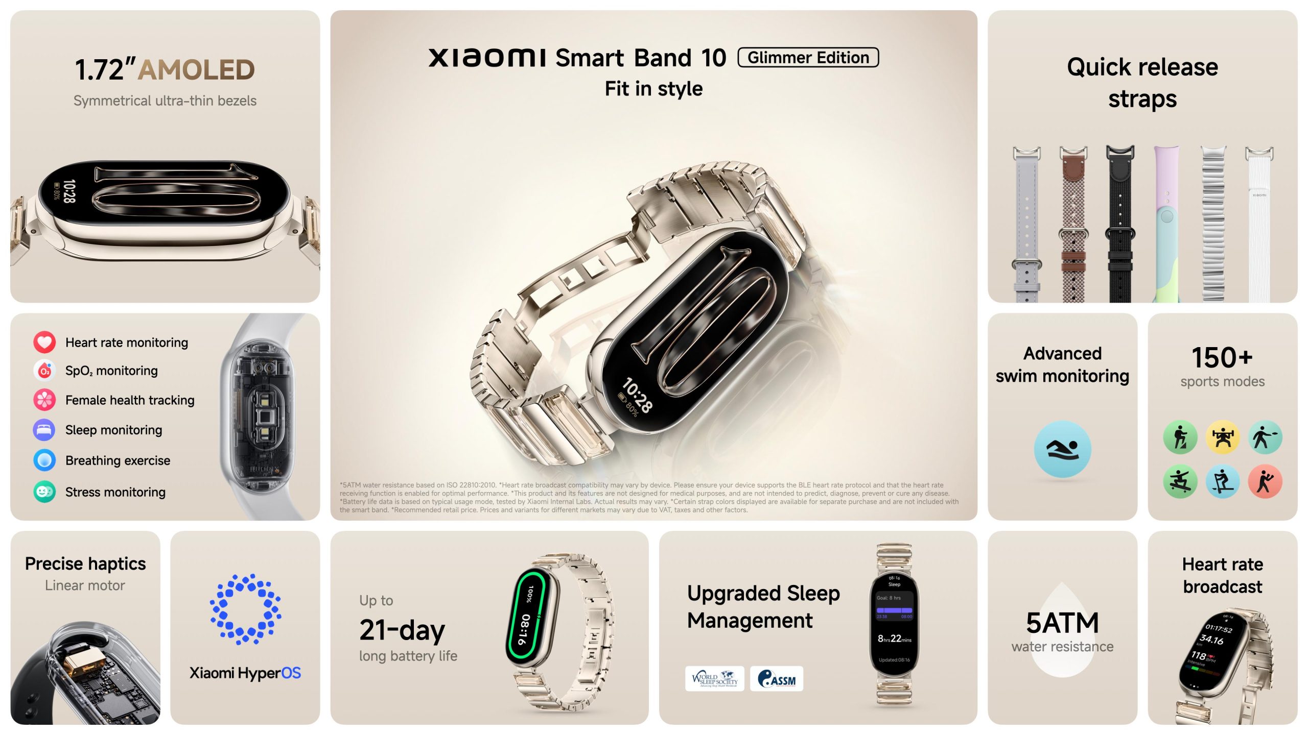 Xiaomi celebrates ten years of wearable innovation with the launch of the Xiaomi Smart Band 10 Glimmer Edition, designed for users who want both style and everyday practicality. The Glimmer Gold model adds a premium look, featuring a high-quality metal strap inlaid with six Preciosa glass crystals and an aluminum alloy frame with a high-gloss PVD finish.