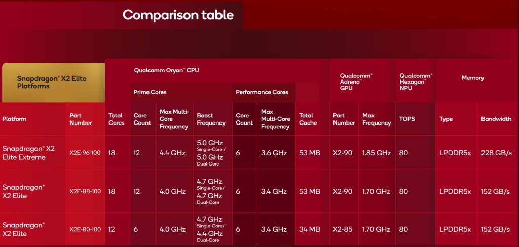 Quick Specs: Snapdragon X2 Elite Extreme & X2 Elite