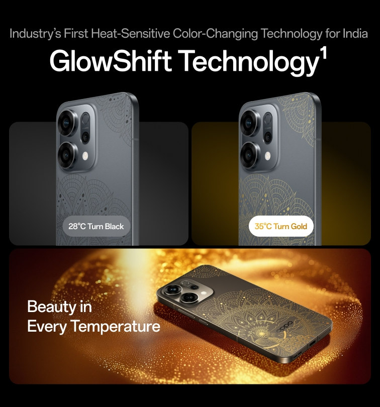 The company says that it has the industry’s first heat-sensitive colour-changing technology in India. Its GlowShift Technology transforms the phone’s back panel from a deep festive black to radiant gold at body temperature, it added.