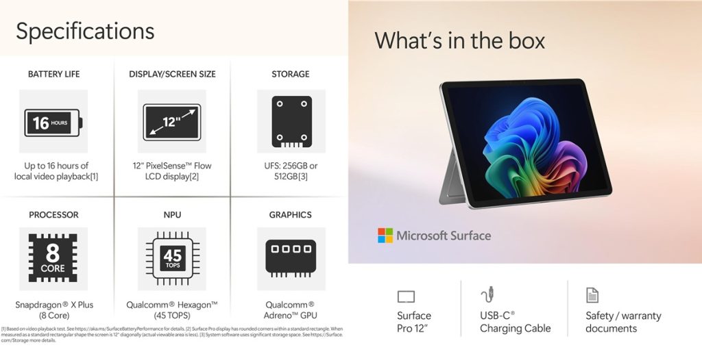 The device is powered by the Snapdragon X Plus processor with a 45 TOPS NPU, delivering smooth AI-optimized performance, up to 16 hours of video playback, a 12-inch PixelSense Flow Touch Display with up to 90Hz refresh, and two USB-C ports for external displays and fast charging.