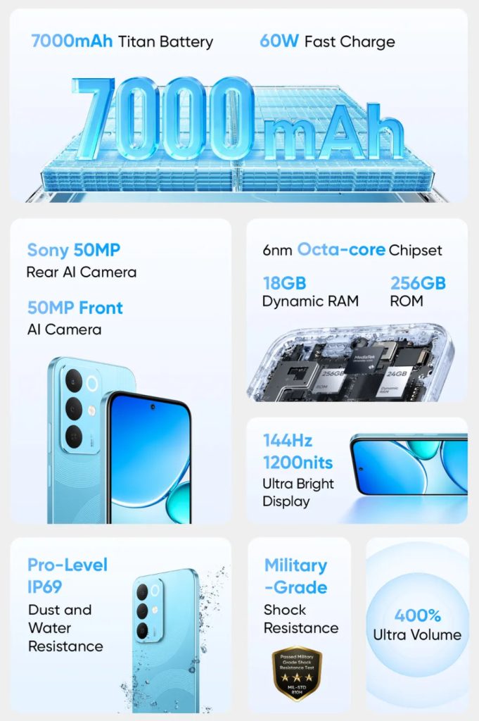 realme has also confirmed 7000mAh battery with 60W fast charging, 50MP rear camera with Sony sensor, 50MP front camera, IP69 ratings for dust and water resistance, 144Hz LCD screen with up to 1200 nits peak brightness, military-grade durability (MIL-STD 810H certification) so it can survive 2m drops, and 400% ultra volume.