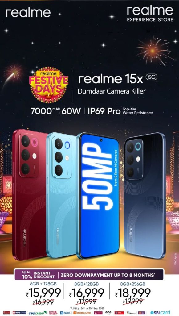 The realme 15x 5G will be available from realme India online store, Flipkart and offline stores starting from October 1st at 12 noon.