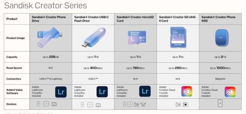 The Creator Series delivers speed, durability, and reliability for high-resolution video, generative AI projects, and creative workflows. These solutions allow creators to capture, transfer, edit, and store content efficiently. Each product comes with a complimentary trial of Adobe software—three months of Adobe Lightroom or one month of Adobe Creative Cloud.