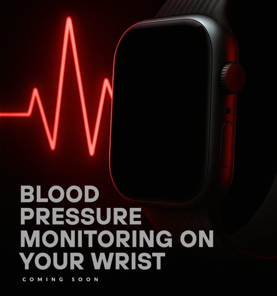 The promotional material shows the silhouette of a smartwatch accompanied by an ECG-like pulse line and the tagline, “Blood Pressure Monitoring on Your Wrist – Coming Soon.” This feature would mark a significant addition to the health-tracking capabilities commonly available on consumer smartwatches.