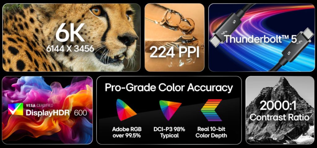 The monitor is also designed to function as a professional hub. It includes built-in KVM switching for seamless control over both Mac and Windows systems and supports daisy-chaining. This allows users to connect two 6K monitors for an expanded workspace, providing nearly five times the screen area of a single UHD 4K monitor.