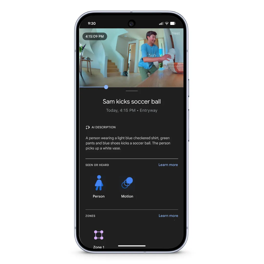 - Al descriptions: Gemini now provides Al descriptions directly in your alerts and your camera video history, giving you a full, detailed narrative of what’s happening.