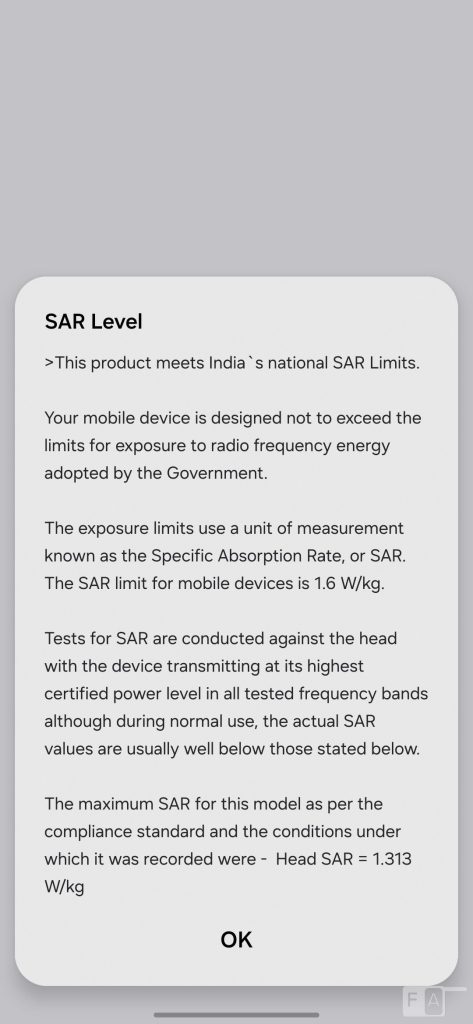 The Galaxy S25 FE’s head SAR is at 1.31/Kg which is higher than the Galaxy S24 FE, but it is well under the limit in India which is 1.6 W/kg (over 1 g).