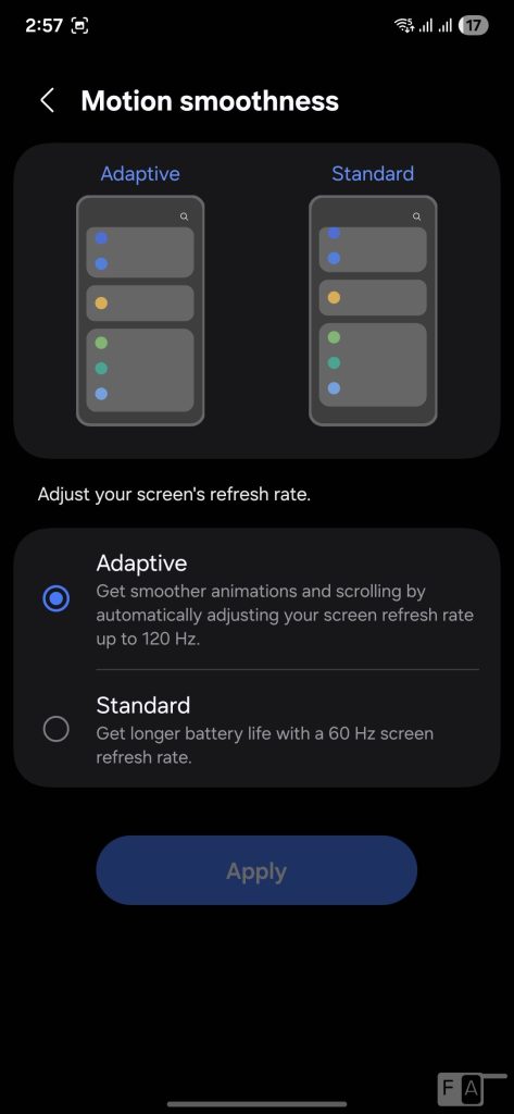 It has a 120Hz refresh rate screen that offers a fluid user experience with smoother animations, scrolling and gaming. There is no mention of an LTPO panel, since there is only mention of 60Hz or 120Hz adaptive refresh rate. Sometimes it can go to 30Hz and even 1Hz when is is static, so it is likely an LTPO panel.