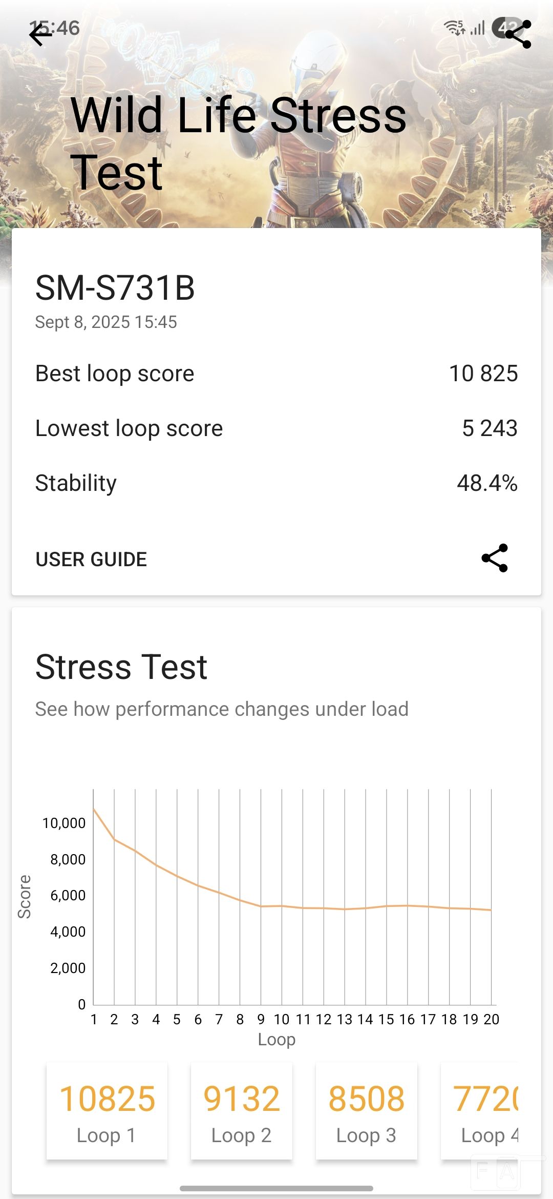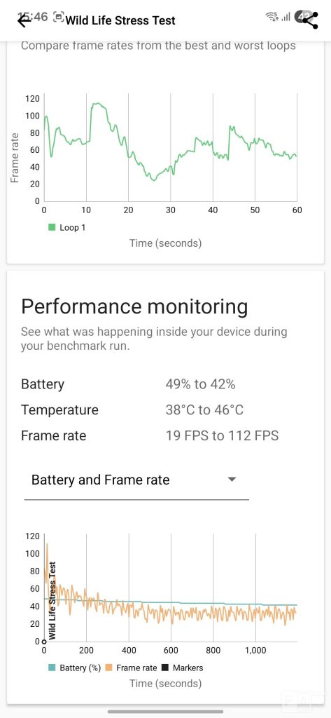 We did not face any issues or frame drops in the graphic-intensive games like COD, BGMI and Genshin Impact. In 3D Mark wild life stress test, it scored 48.4%, which is better than the Galaxy S25. Temperature shot up from 38 to 46 degrees. That said, check out some synthetic benchmark scores below.