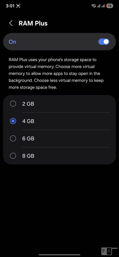 There is also a RAM Plus feature, which uses the internal memory of the phone to expand the RAM by an extra 8GB, in addition to the existing 8GB of RAM. This is enabled automatically, but can be disabled.