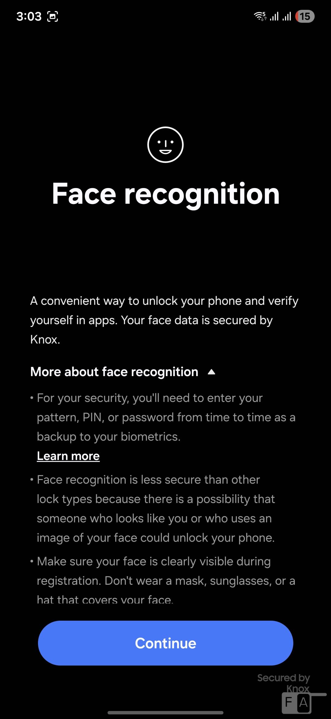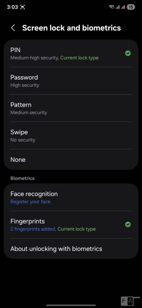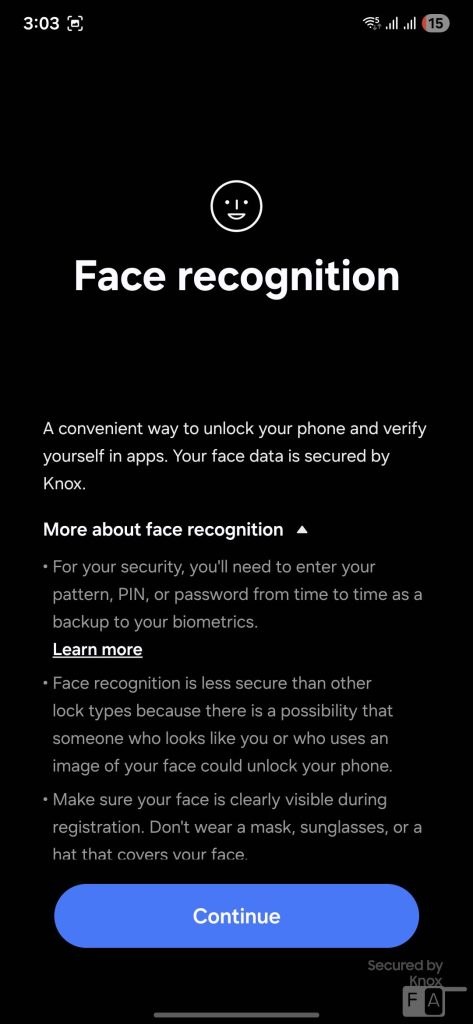 The phone has an in-display optical fingerprint sensor which is good enough to unlock the phone quickly. You can add up to 4 fingerprints, and adding fingerprint is easy. It has support for Face recognition, which doesn’t work well if the lighting is poor in the room, if you use hats or sunglasses. Both these are protected by Knox security.