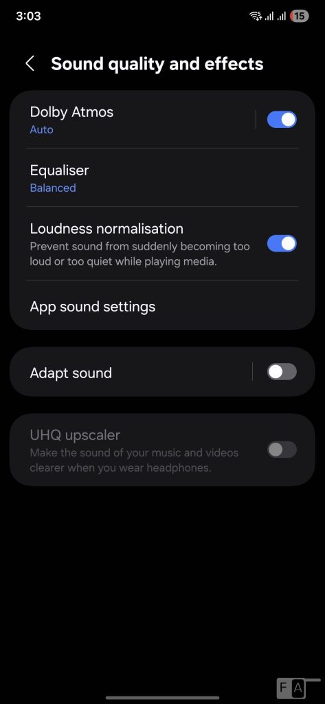 YouTube Music is the default music player. It has equalizer, Dolby Atmos, UHQ upscaler, and Adapt that can be enabled from the settings. All these improve the audio when listening through earphones, and Dolby Atmos also works with speakers. It doesn’t have FM Radio support. That said, audio through earphones is good. Loudspeaker output from the stereo speakers is good.