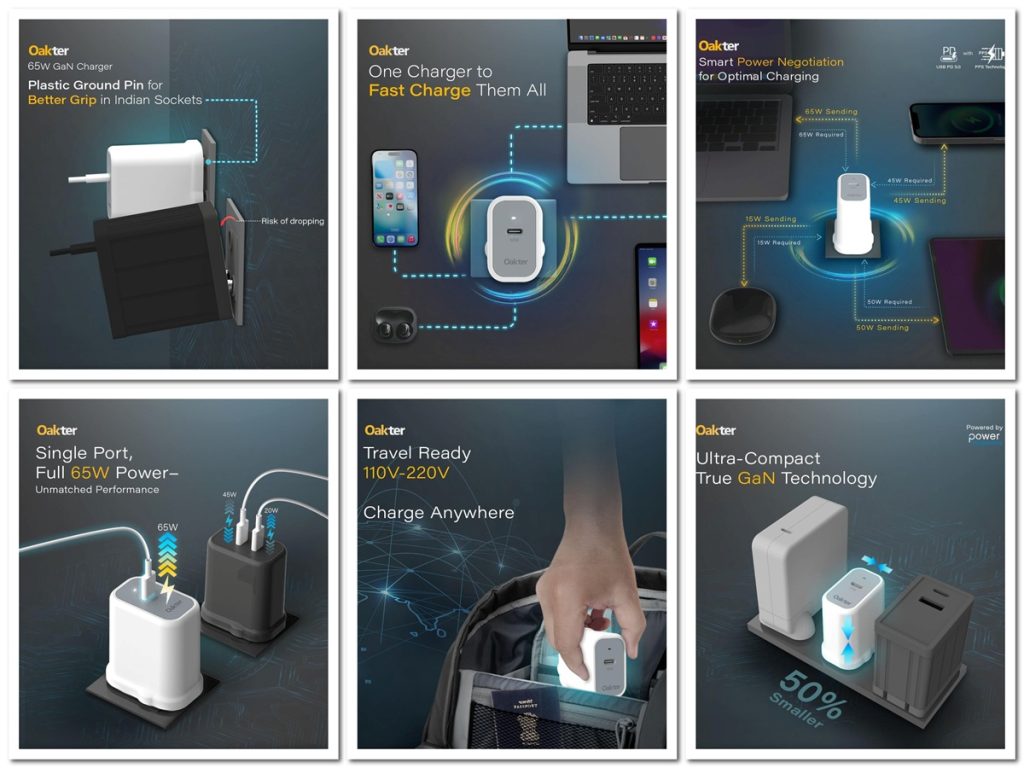 Oakter has launched the 65W True GaN Charger in India, designed for efficient charging of modern devices. It uses Gallium Nitride (GaN) technology, which enables a compact and lightweight design while delivering consistent power.