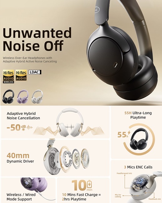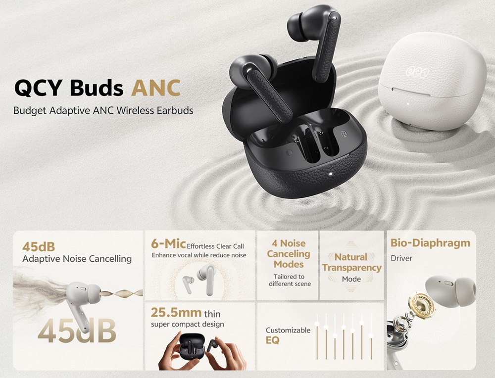 The HT05 Pro offers 45dB adaptive hybrid ANC with six microphones, four noise-canceling modes, and a transparency mode. It is capable of reducing noise by 97%. The leather-textured, compact 25.5mm design houses a bio-diaphragm driver with nine preset/custom EQ modes via the QCY Smart App. It provides 25-hour playback (10-min charge = 1h), dual pairing, IPX4 splash resistance, and Bluetooth 5.4 connectivity.