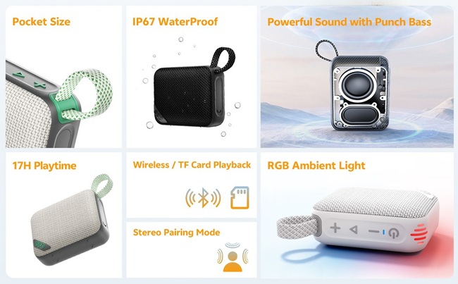 The SP2 is compact with a 45mm wool-blend driver, nine EQ presets via Smart App, Bluetooth 5.3, TF card input, stereo pairing, and 17-hour battery life. It is IP67-rated for waterproof and dustproof performance, with RGB ambient lighting and dual-speaker sync.