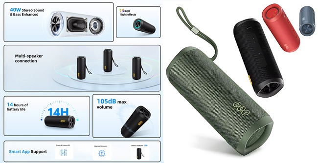 The SP7 delivers 40W Hi-Fi stereo sound through a quad-driver setup, including a 30W silk-dome tweeter, dual woofers, and a 10W racetrack mid-low driver. It supports TWS multi-speaker pairing, dynamic RGB lighting, studio-grade EQ via the QCY Smart App, 14-hour playback, and is IPX7 waterproof for indoor and outdoor use.