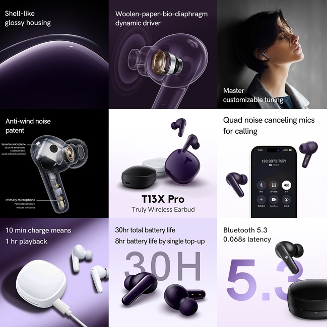 The T13X Pro features a glossy design and a woolen-paper bio-diaphragm dynamic driver. Quad-mic ENC and patented wind noise cancellation ensure call clarity. It supports 68ms latency, 30-hour playback (10-min charge = 1h), multi-device pairing, IPX4 resistance, nine EQ modes via Smart App, and dual pairing.