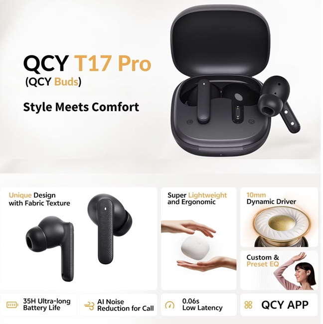 The T17 Pro has a fabric-textured finish and ergonomic design. It features a 10mm dynamic driver, AI wind noise reduction, and 68ms low latency. Playback lasts up to 35 hours with the charging case (350mAh) and USB Type-C charging. Bluetooth 5.3 supports iOS and Android devices. The earbuds are IPX4-rated and support smart touch controls with nine preset EQ modes via the QCY Smart App.