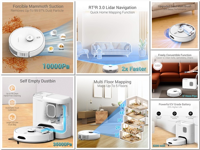 The robot also includes anti-fall sensors, self-diagnosis, and OTA software updates, and its compact design allows cleaning under sofas and around furniture legs.