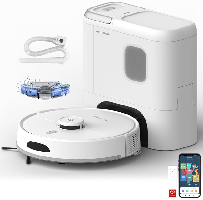 - Included Accessories: Robot unit, convertible dustbin/charging station, 2 dust bags, cleaning brush, rolling main brush, 2 side brushes, HEPA filter (1+1), microfiber mop (1+1), charger, manual