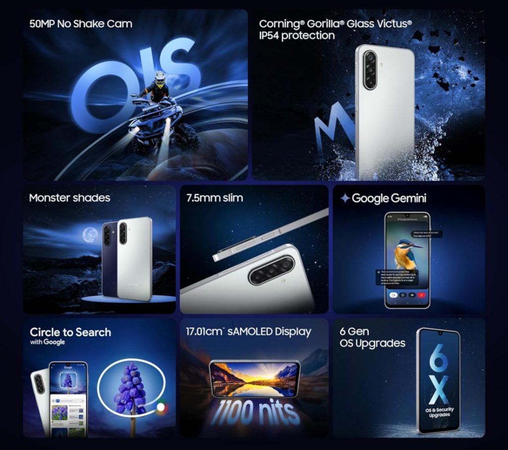 It retains the 50MP main + 5MP ultra-wide + 2MP macro camera and a 13MP front camera. The phone runs Android 15 with One UI 7 on top, has Gemini Live features and will get 6 OS updates and 6 years of security updates. The screen has Corning Gorilla Glass Victus protection.