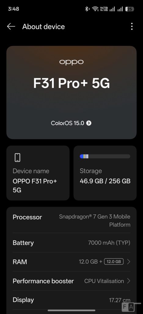 The OPPO F31 Pro 5G runs Android 15-based ColorOS 15 out of the box. The phone will get 2 Android updates and 3 years of security updates. ColorOS 15 brings a minimalist aesthetic, featuring a visually harmonious and sophisticated interface, enhanced by integrating diffuse shadows, natural blurs, and dual-layer blending.