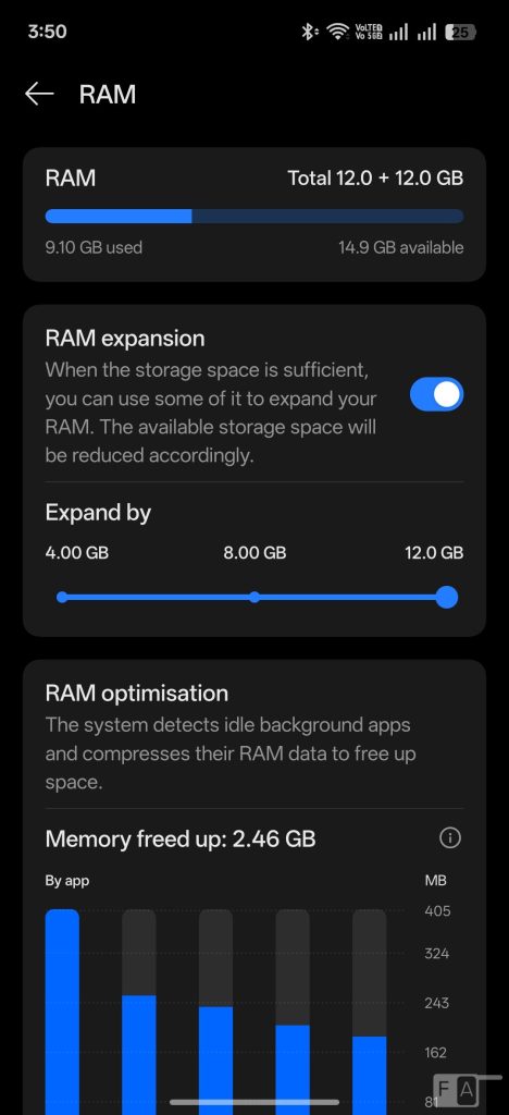 Out of 12GB LPDD4x RAM, you get 10.95GB of usable RAM, and about 6GB of RAM is free when default apps are running in the background. It also has DRE or dynamic RAM expansion feature, which uses the built-in storage as RAM. This has up to 12GB of additional RAM expansion.