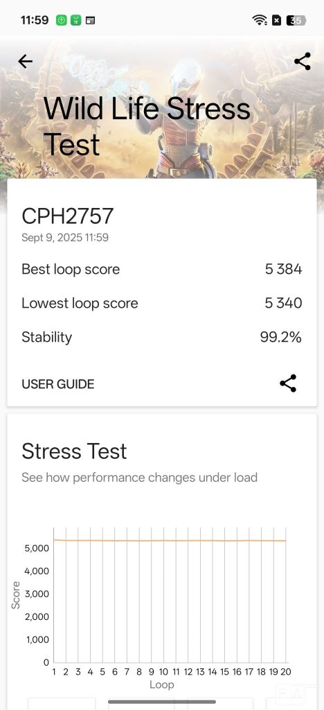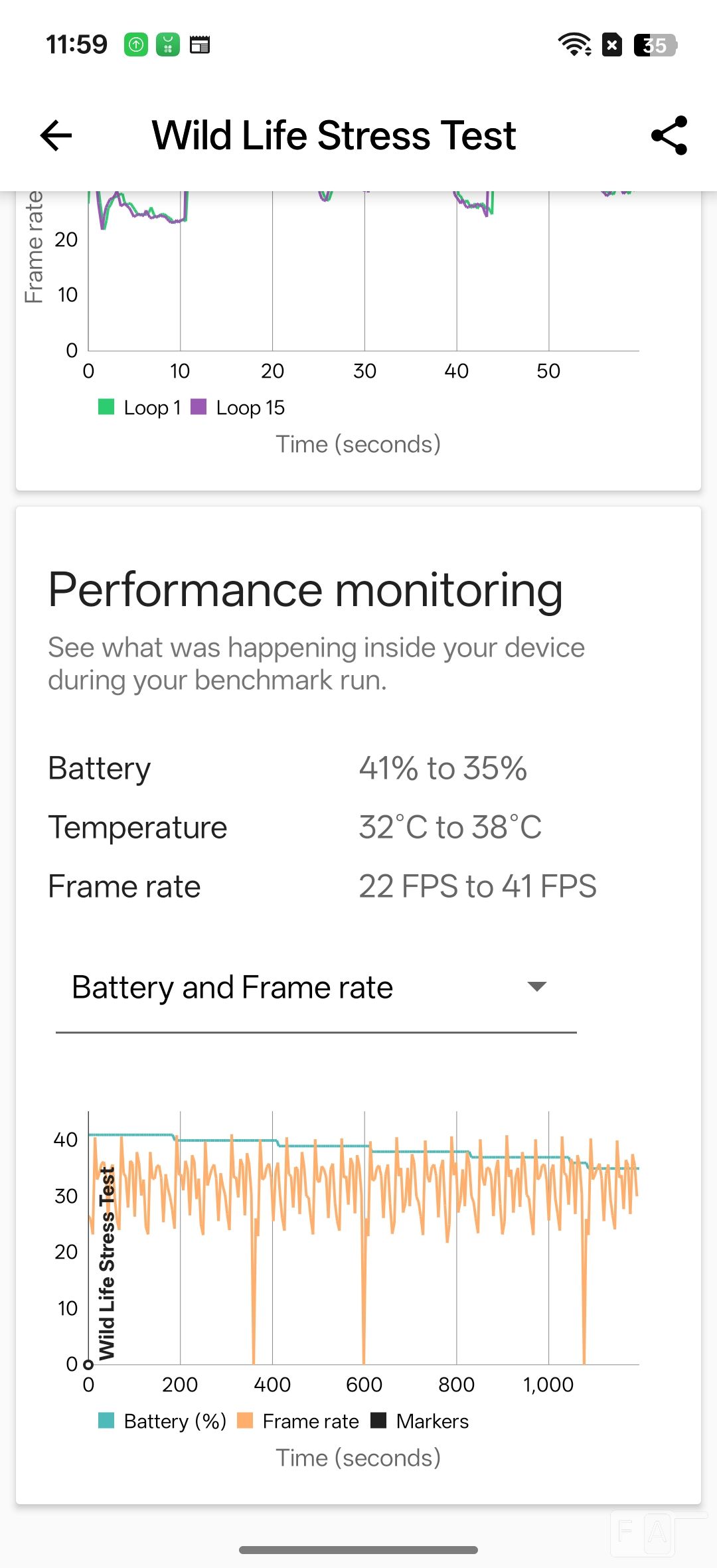 In 3D Mark wild life stress test, it scored 99.2% which is good, and the temperature shot up from 32 to 38 degrees. That said, check out some synthetic benchmark scores below.