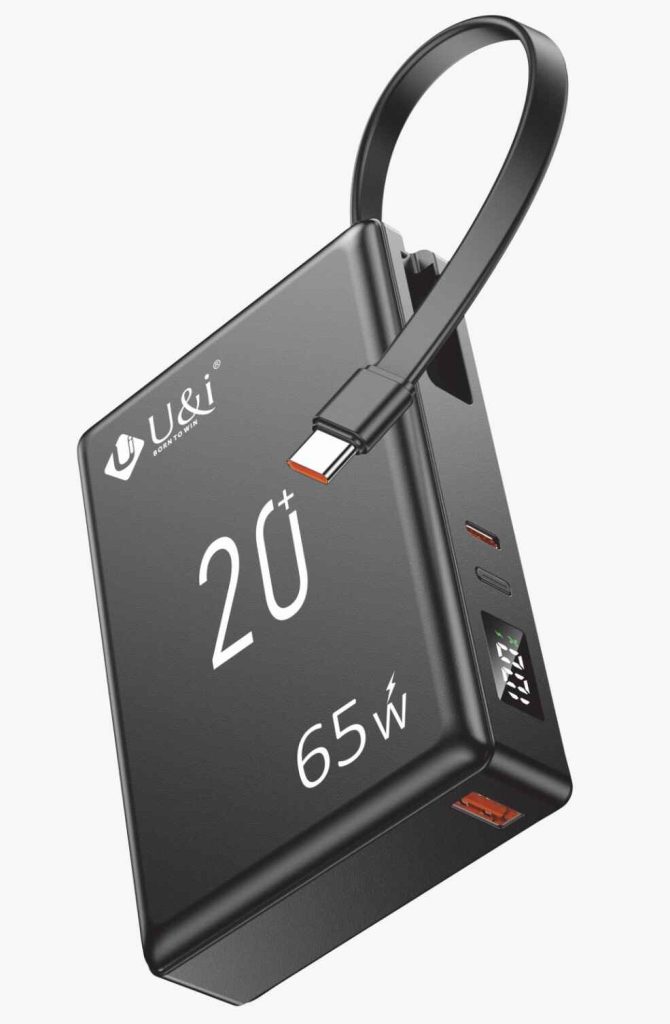 The UiPB 2701 Classy is a high-capacity power bank featuring a 20,000 mAh battery. It is equipped with a 65W Power Delivery (PD) output, making it suitable for charging larger devices like laptops, in addition to smartphones and tablets.