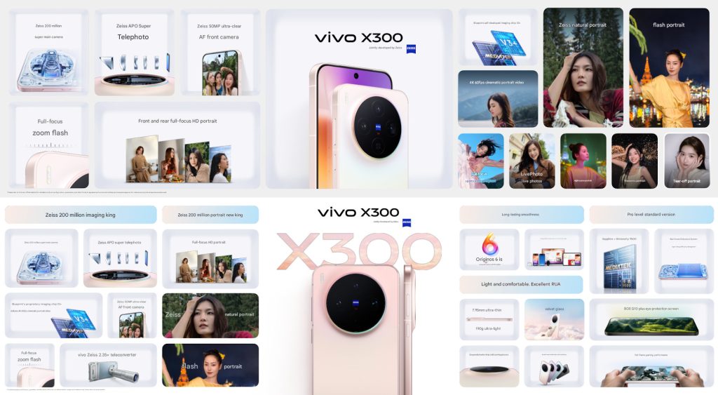 The vivo X300 has a 6.31-inch LTPO OLED display with 1.05mm ultra-narrow bezels on all the sides. The X300 Pro retains the 6.78″ 1.5K 120Hz LTPO OLED display, which as 1.1mm ultra-narrow bezels on all the sides. Both the phones use BOE Q10+ material, feature full-brightness DC dimming and 2160Hz PWM dimming, local peak brightness of 4500nit, minimum 1nit, and supports full-link Zeiss natural color management.