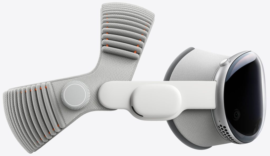The Dual Knit Band has a 3D-knitted dual-rib structure for cushioning, stretch, and breathability. Tungsten inserts in the lower strap provide counterweight for balance. The dual-function Fit Dial allows precise adjustment. Available in small, medium, and large, it is compatible with earlier Vision Pro models and sized via the Apple Store app.