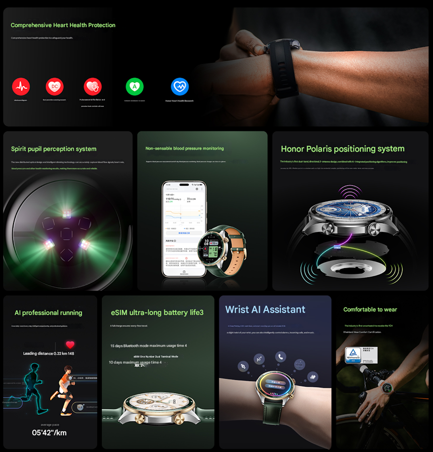 - Battery Life: Bluetooth 15 days, eSIM dual-terminal 10 days, standalone eSIM 3 days (AOD reduces usage time)