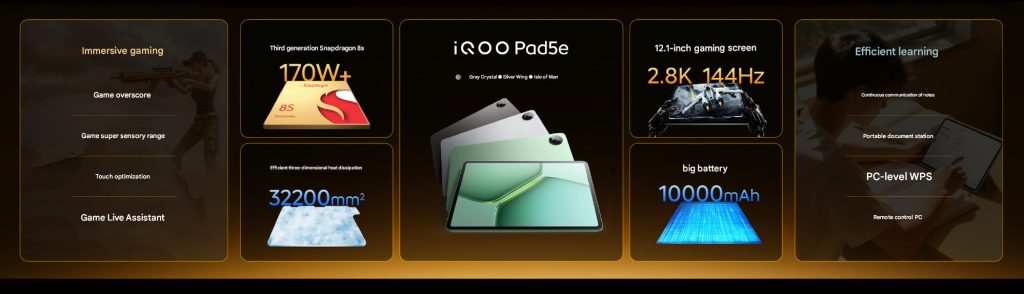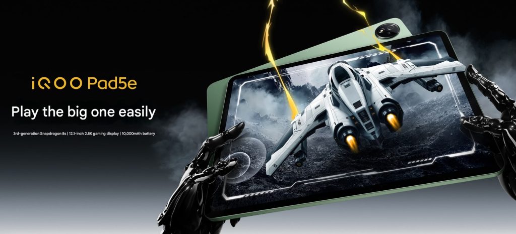 The iQOO Pad5e is a version of the vivo Pad5e tablet that packs a 12.1-inch 2.8K 144Hz LCD screen, is powered by Snapdragon 8s Gen 3 SoC, has 32200mm² high-efficiency three-dimensional heat dissipation, a 8MP rear camera, 5MP front camera, 4 speakers, and a huge, 10000mAh battery with support for 44W fast charging.