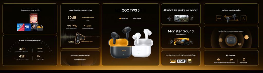 The iQOO TWS 5 has similar specifications as the vivo TWS 5. It has 60dB ANC with 5500Hz noise reduction, up to 45 hours of battery life, Bluetooth 5.4 LE, LDAC, 2nd gen ceramic tungsten acoustic diaphragms, has microphones for AI call noise reduction, 44ms full-link low latency.