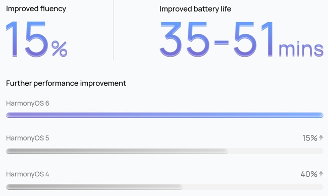 Powered by the Ark Engine, HarmonyOS 6 achieves smoother responsiveness and faster operations across devices. Multi-device performance is improved by 15% compared to HarmonyOS 5 and up to 40% over HarmonyOS 4, with battery life extended by 35 to 51 minutes, based on lab tests.